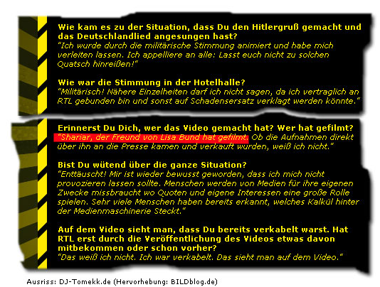 DJ Tomekk erlaubte sich übrigens den übermütigen parodistischen Spaß, obwohl er zu diesem Zeitpunkt wußte, daß er bereits "verkabelt" war, die Redaktion von RTL also alles mithören und mitschneiden konnte, wie er in diesem Interview bestätigt: http://www.bildblog.de/wp-content/tomekkDE.jpg Deshalb sah RTL wohl auch keinen Handlungsbedarf. Erst nachdem "Bild" mal wieder in der Rolle des Denunzianten glänzte, blieb den Verantwortlichen von RTL keine andere Wahl, als DJ Tomekk aus dem Camp zu entfernen. Und jetzt tritt "Bild" noch einmal in der gewohnten ekelhaften Weise nach und fragt in der Stuttgarter Ausgabe: "Darf der bei uns jetzt schon auftreten, nur wenige Wochen nach seiner Entgleisung in der Glotze?". Ja, er darf. Genauso wie "Bild"-Redakteure jeden Tag erneut ihre oft halb erlogenen Geschichten drucken dürfen. Mehr dazu aktuell auf "BILDblog": Welcher "Nazi-Skandal" nochmal?! Gruß Ben |